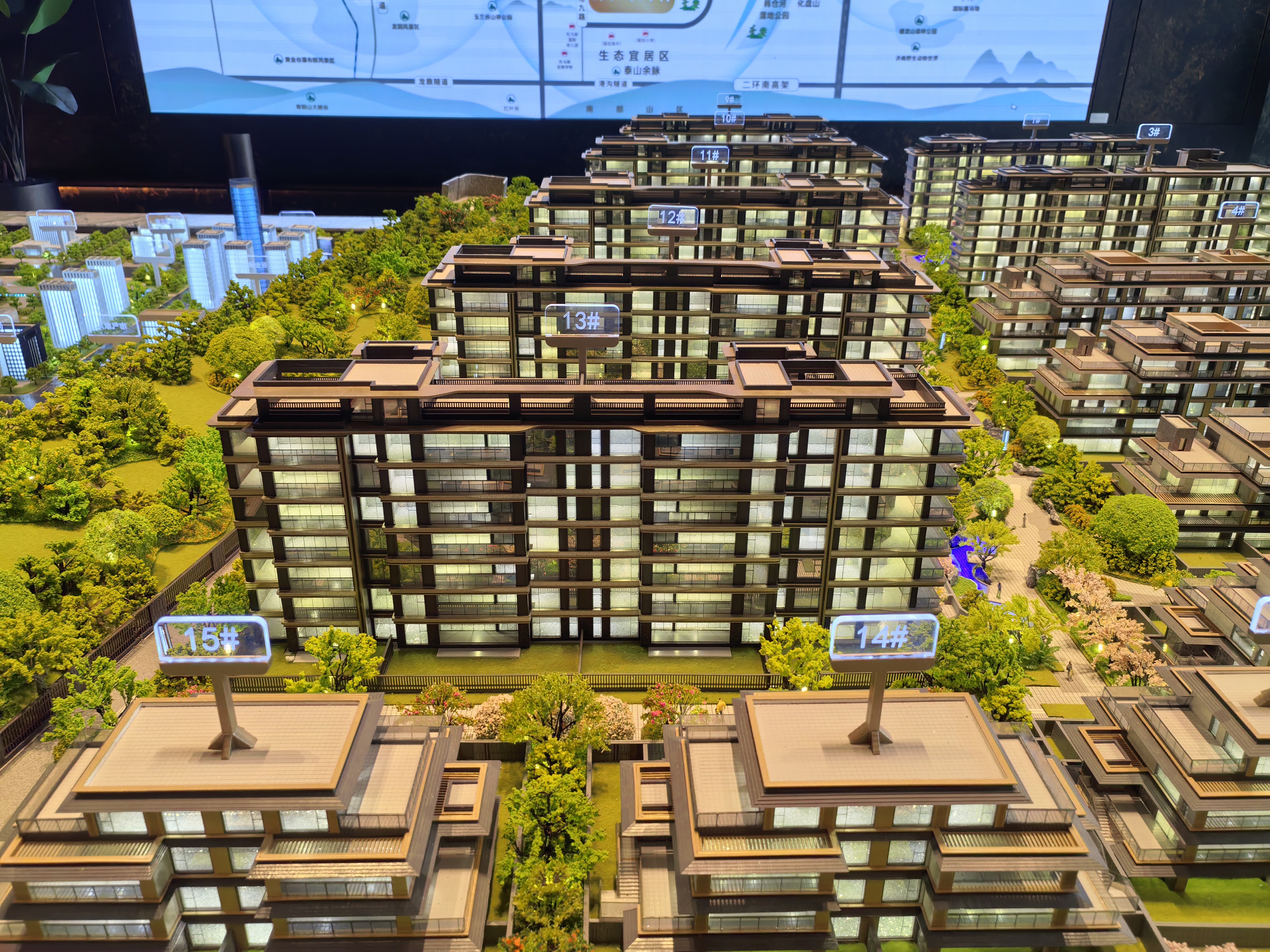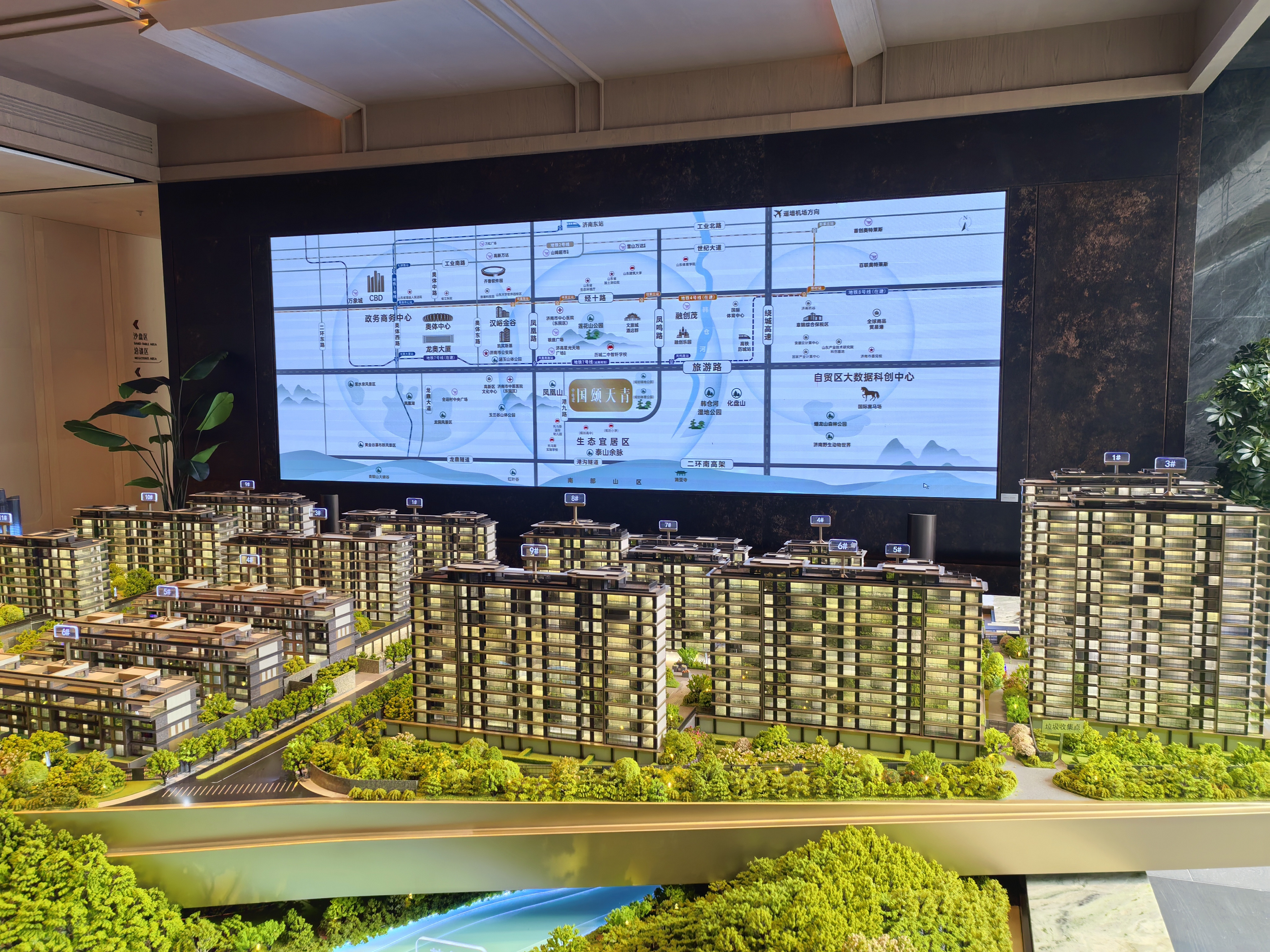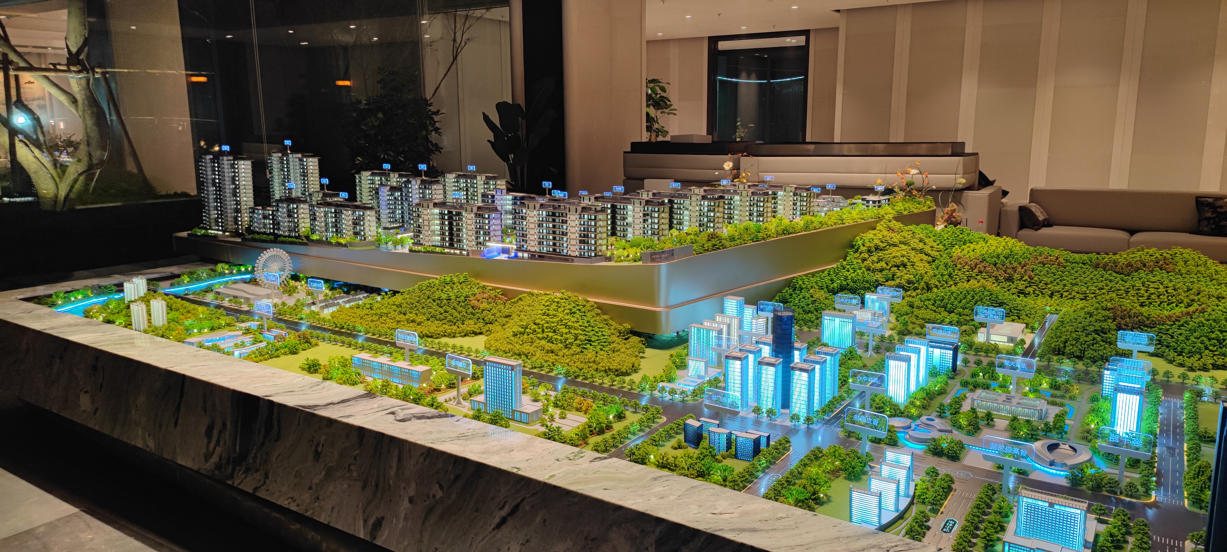 项目主体由子盘的形式放大呈现,以1/110的景观比例和1/120的建筑比例进行制作,在母盘上项目位置处进行一个抬升处理,重点突出国颂天青项目主体,沙盘整体采用多媒体控制终端控制各区域灯光系统并且与大屏联动展示。