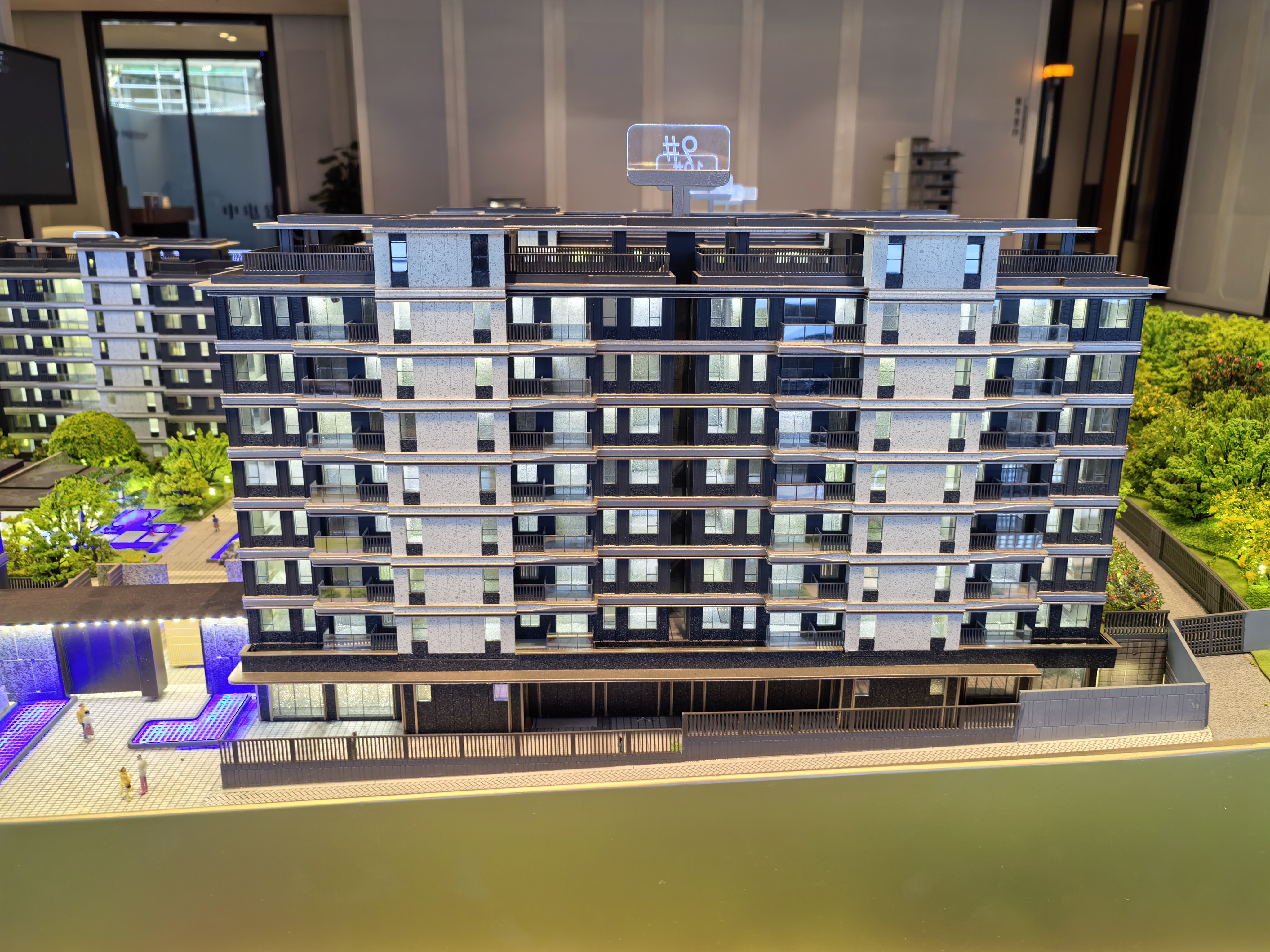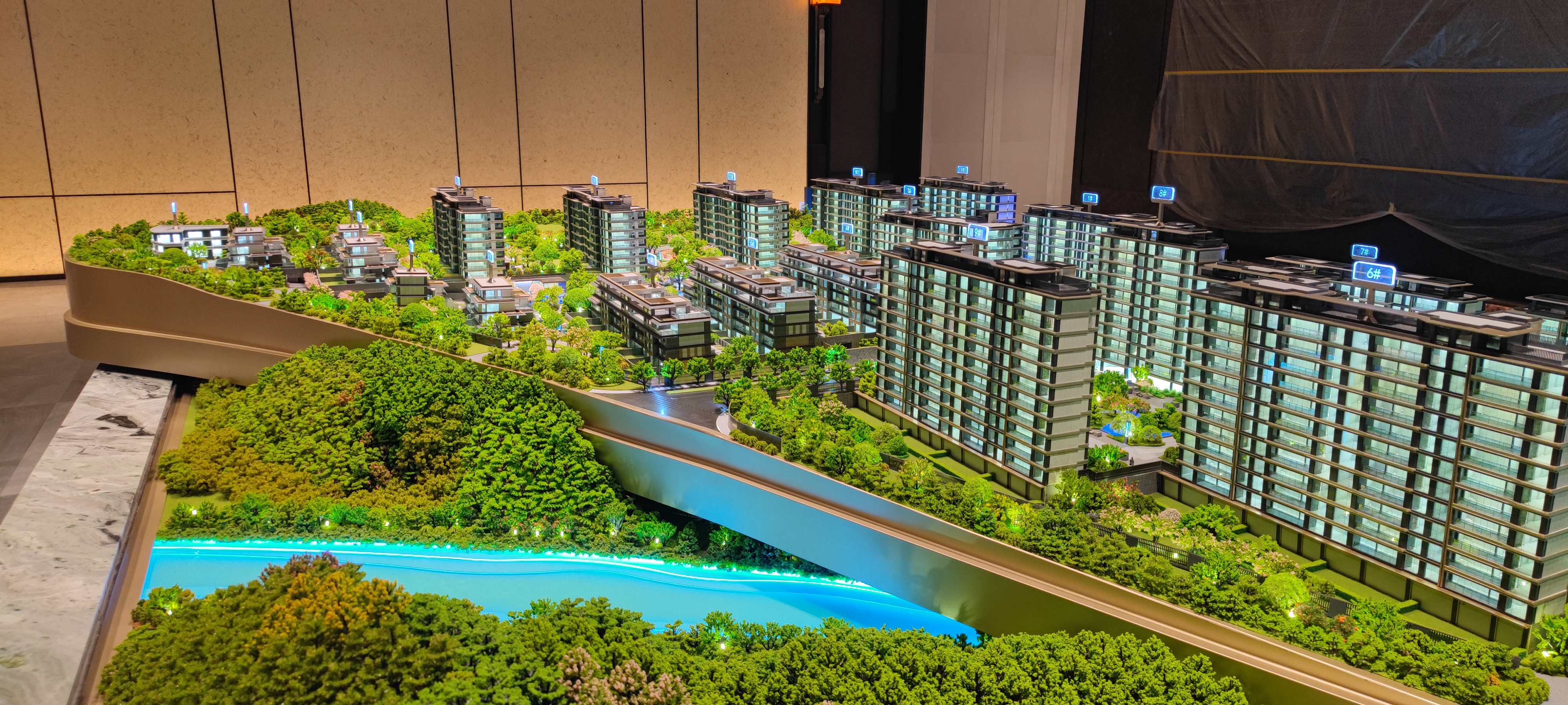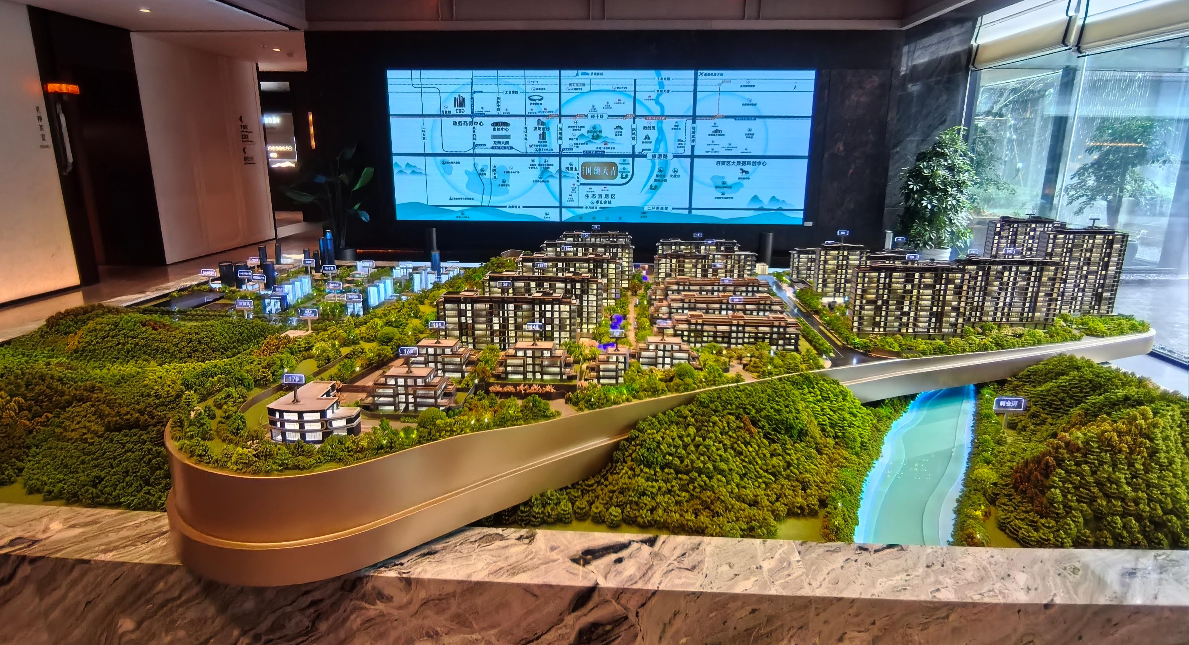 项目主体由子盘的形式放大呈现,以1/110的景观比例和1/120的建筑比例进行制作,在母盘上项目位置处进行一个抬升处理,重点突出国颂天青项目主体,沙盘整体采用多媒体控制终端控制各区域灯光系统并且与大屏联动展示。